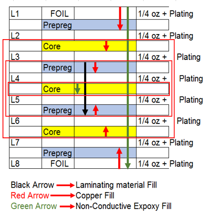 L’image de droite illustre le type de HDI, dans lequel nous nous spécialisons. Nous avons en stock des feuilles de 1/4 oz et 3/8 oz pour vos besoins en HDI. Nous sommes également capables d’effectuer le retour des perçages arrière, à profondeur contrôlée et des trous à ajustement forcé (tolérance du trou faible). Bittele a possibilité d’utiliser des noyaux (stratifiés) aussi mince que 0,001". Nous offrons également des noyaux à capacitance enterré (BC). Les autres technologies comprennent la finition double, l’écran de sérigraphie et soudure en couleurs multiples, des doigts (gold fingers) à dimensions courts, des constructions hybrides, etc…